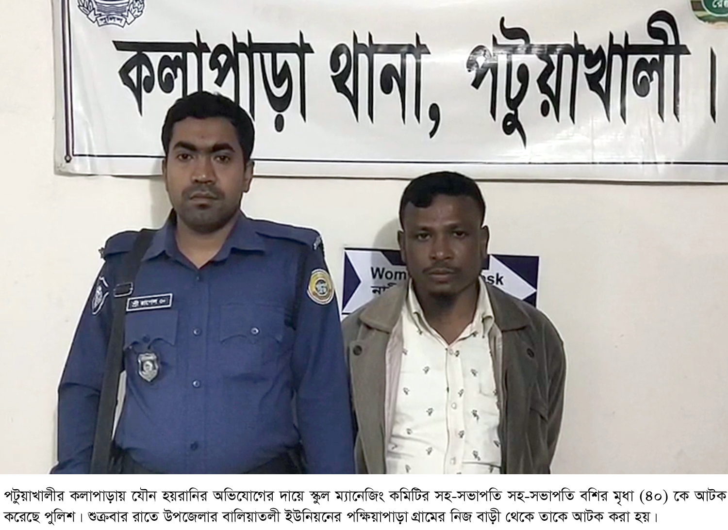 কলাপাড়া (পটুয়াখালী)প্রতিনিধি : পটুয়াখালীর কলাপাড়ায় যৌন হয়রানির অভিযোগের দায়ে স্কুল ম্যানেজিং কমিটির স... বিস্তারিত